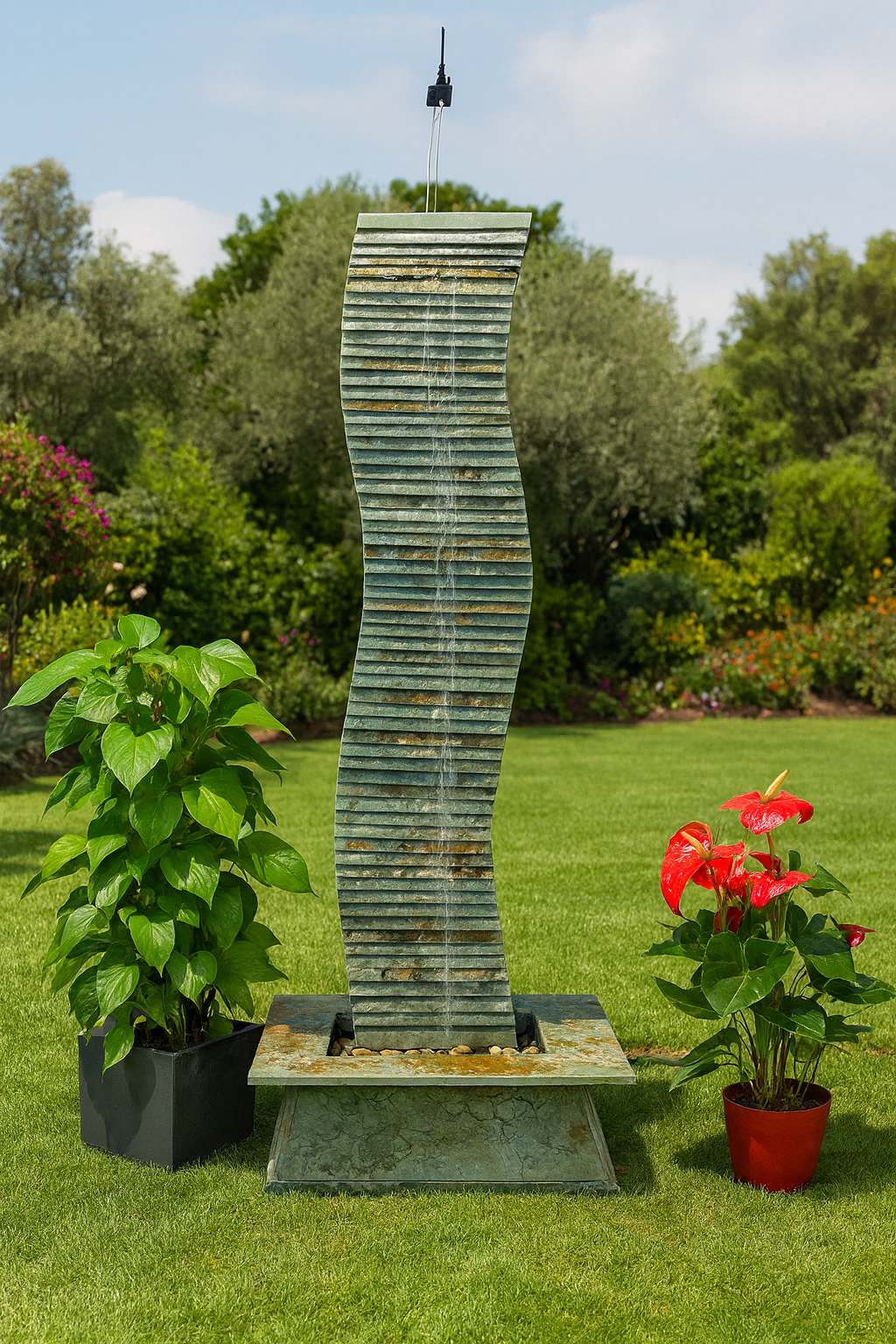 La base della cascata è decorata con ciottoli naturali, aggiungendo un tocco di autenticità alla cascata. Il suono dell’acqua che scorre contribuisce a creare un ambiente tranquillo, perfetto per momenti di meditazione o semplicemente per alleviare lo stress quotidiano. Grazie alla sua costruzione robusta e ai materiali di alta qualità, questa cascata è facile da installare e richiede poca manutenzione, garantendo lunga durata e bellezza senza tempo. Non è richiesto alcun accesso all’impianto idrico, basterà posizionare questa fontana da tavolo su una superficie di qualsiasi zona, riempirla d’acqua e collegarla a una presa elettrica.