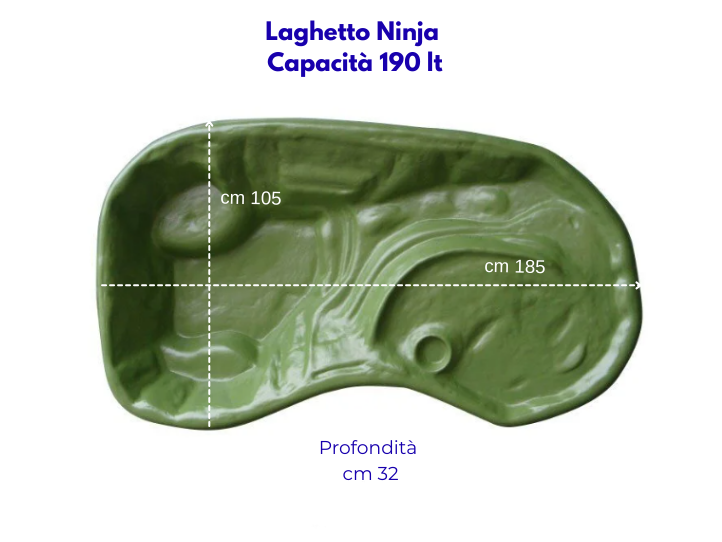 Il laghetto Ninja è un modello unico all’interno della linea economica di Giardini d’Acqua, studiato appositamente per ospitare tartarughe d’acqua di medie dimensioni in totale sicurezza e comfort. Con le sue dimensioni di 185 x 105 cm e una profondità di 32 cm, offre uno spazio ben strutturato per l’attività , il nuoto e il riposo di questi animali.
